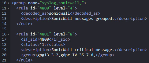 - Lastly, I also tuned and modified the wazuh default ruleset for sonicwall syslog to create alerts based on lower log severity levels.
