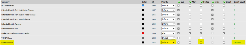 - Uncheck syslog from alerting for redundant alerts. For example, under Network > Network Access > Packet Allowed, consider adjusting the log level or disabling syslog alerting. By default the category of this alert is simply inform. Under wazuh’s default ruleset inform logs are simply discarded and ignored, if something such as packet allowed is important to you simply change the log level to alert/emergency, and by wazuh’s default ruleset an alert will be generated for review.