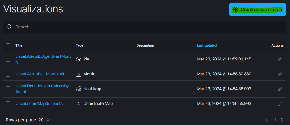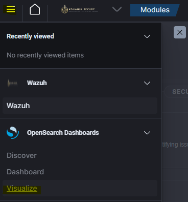 - Navigate to your Wazuh portal and access OpenSearch Dashboards by selecting Menu > OpenSearch Dashboards > Visualize.
