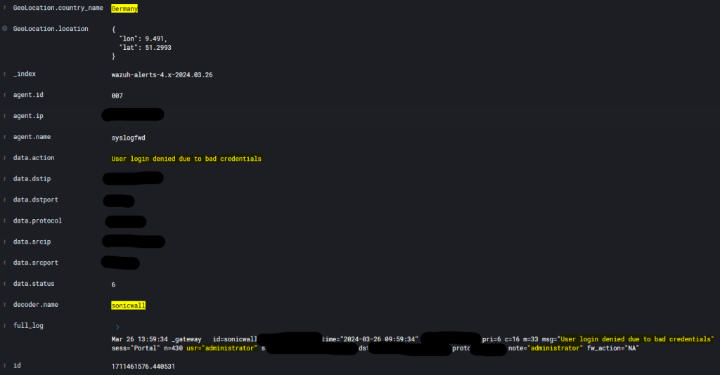 decoder.nameas “sonicwall” andGeoLocation.country_nameas the identified country name appears on the heatmap. - Upon investigation, I discovered that a “user” was attempting to log in with non-existent or incorrect credentials to a publicly facing login page for my SSLVPN service, and attempted it 631 times over the course of a few weeks.