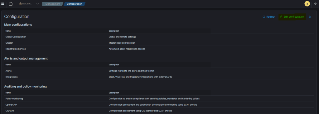 - Navigate to your Wazuh server dashboard and select Management > Configuration > Edit Configuration.