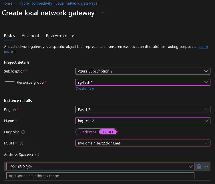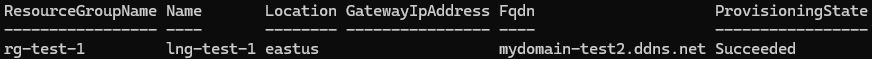 New-AzLocalNetworkGateway -ResourceGroupName rg-test-1 -Name lng-test-1 -AddressPrefix 192.168.0.0/24 -Location EastUS -Fqdn mydomain-test2.ddns.net