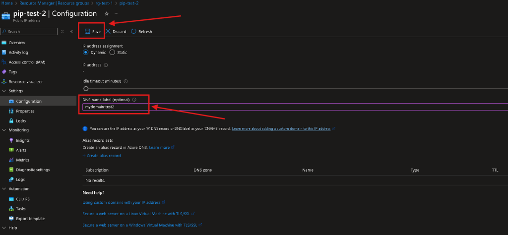 - Under Configuration > Select the textbox under “DNS name label” > Enter your DNS Name for your PIP.