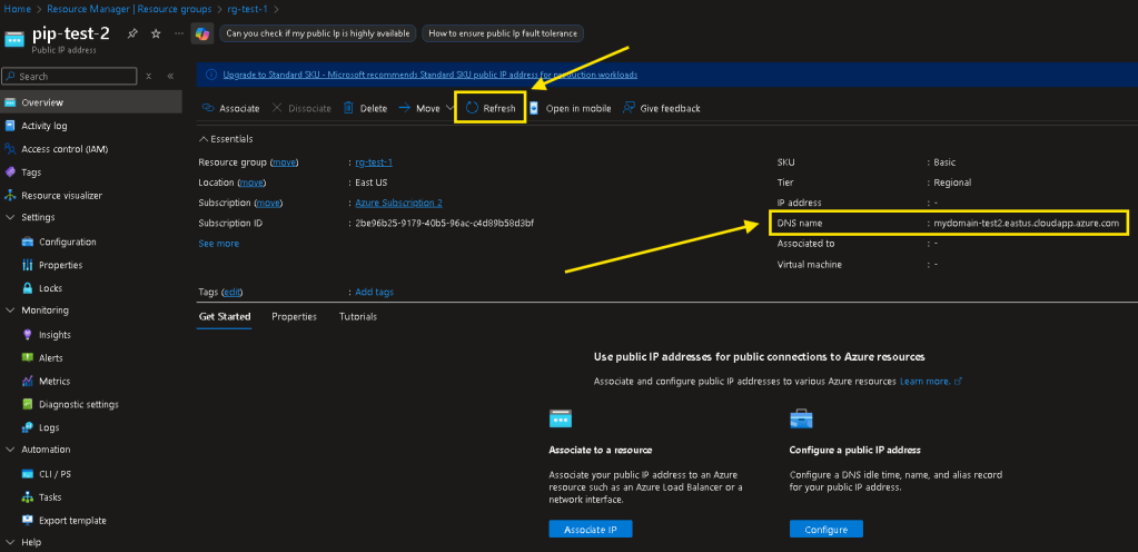 - On the left-hand pane, navigate back to “Overview” > Select “Refresh” > verify your DNS Name now shows the custom one set.