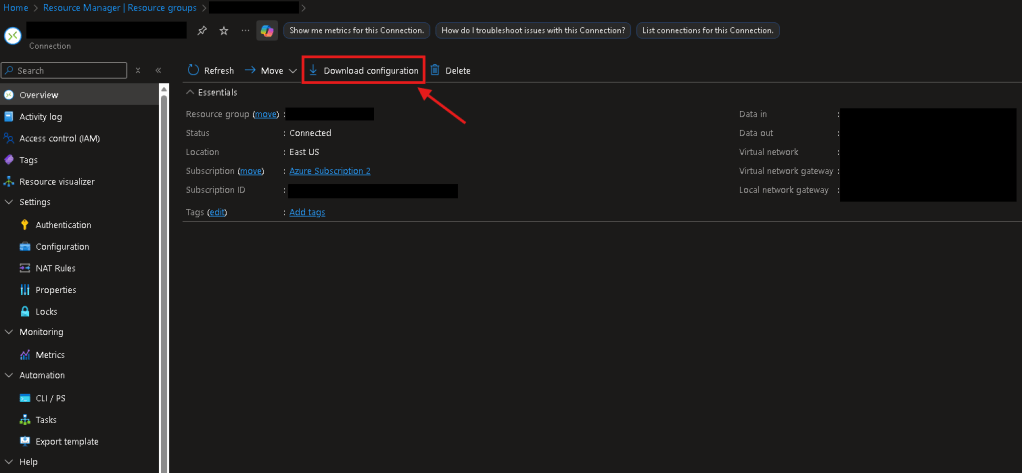 - Run Get VPNGW config for this connection, adjust file path to an adequate place to save the info.
