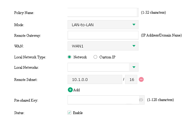 - Remote Gateway: FQDN or PIP of AZVPNGW