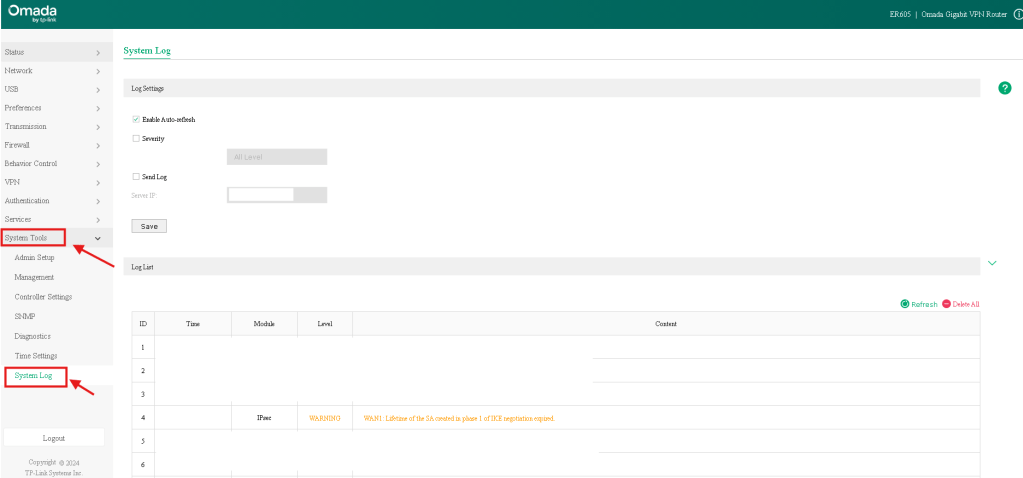 - Under “System Tools” > “System Log” you can find a running feed of logs.