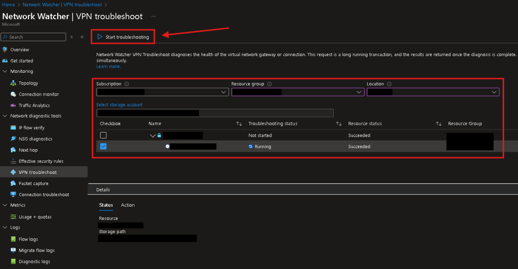 - Lastly click ‘Start troubleshooting’ atop the page to begin. You should see the ‘Troubleshooting status’ change to ‘Running’.